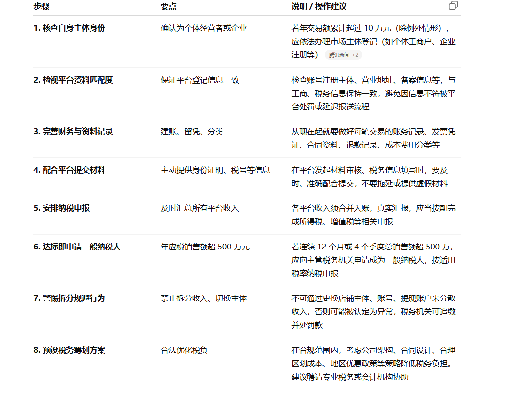 新规实施后,卖家在税务身份、资料审核、报表提交上的门槛会提高。那些长期忽视正规账务管理或用“灰色操作”走捷径的卖家,将面临交易被下架、平台处罚、税务追责等风险。