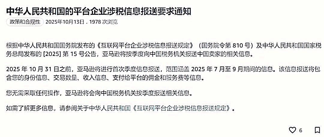 上周末的猜测和扰攘,昨天已尘埃落定!亚马逊昨天向中国卖家发出正式通知,依据中国国家税务总局2025年第15号公告及相关规定,平台已完成在中国税务机关的登记备案,并将自2025年10月起按季度报送中国卖家的涉税信息。这一举措标志着跨境电商税务监管进入新阶段,尤其对以美国站为主的中国卖家带来深远影响。