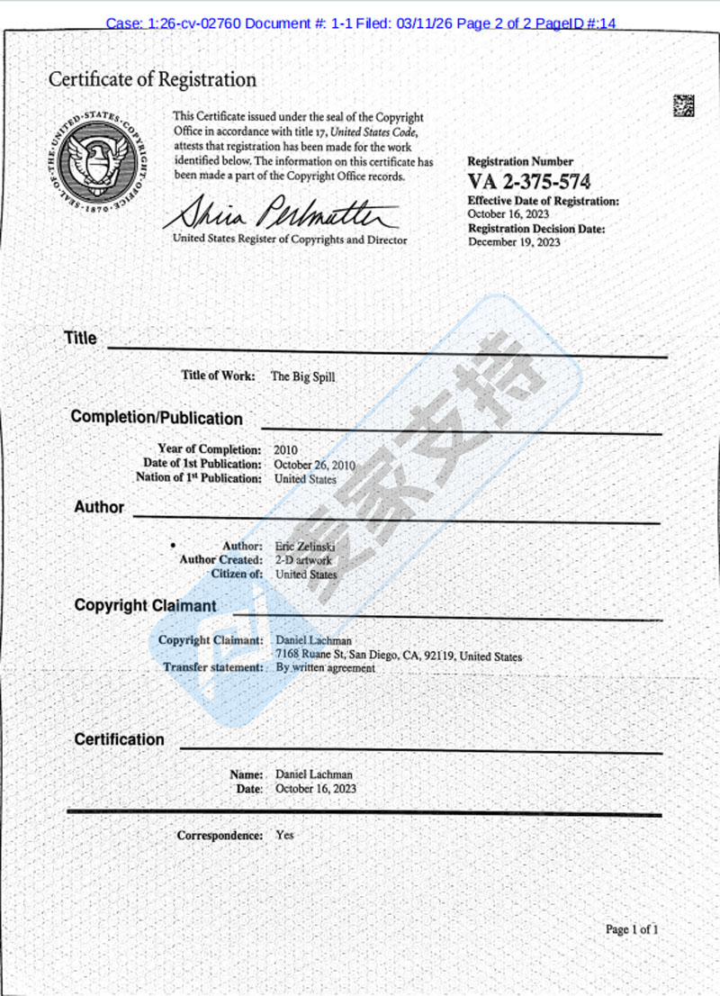 本案是David代理Dan Lachman发起的版权维权案件,涉案版权为2023年10月16日获得版权认证的The Big Spill插画作品,版权号为:VA 2- 375-574。目前该案件暂未公开详细版权图片,但麦家支持通过排查锁定了版权细节图供卖家排查避雷!该版权图片被广泛用于服饰、手机壳等领域,未经授权使用则会面临TRO冻结风险,目前该案件处于前期立案阶段,暂未获批TRO临时限制令!有上架过相关作品的卖家需尽快排查下架!