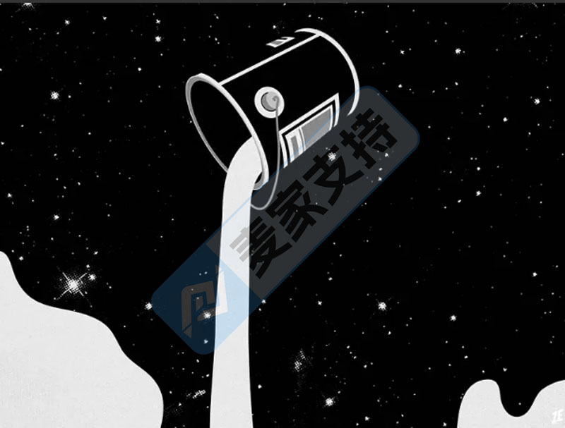 Eric Zelinski是一名来自美国的平面设计师和插画师,其标志性作品The Big Spill是一个超现实主义的黑白设计。画面表现为一个倒下的漆桶,里面流出的白色油漆在黑色背景中汇聚成了一片包含恒星、行星和星系的宇宙空间。