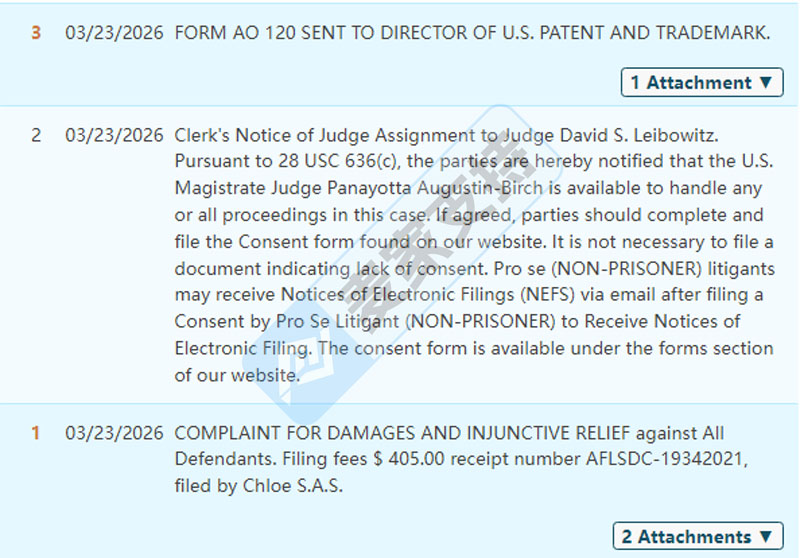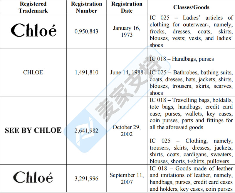 本案是SMG律所代理Chloe S.A.S.在佛罗里达州发起的商标首维权,涉及Chloé以及、CHLOE和SEE BY CHLOE等文字商标,分别注册在第18和25大类,涵盖箱包、钱包、钥匙包以及各类箱包类零部件与配件;服装等类目。