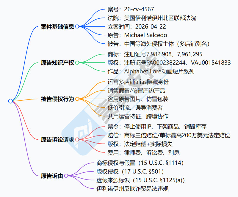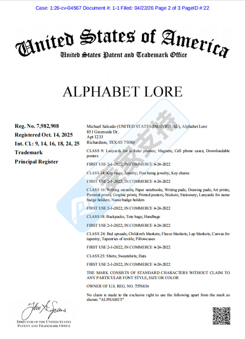 原告Michael Salcedo持有完整且合法有效的知识产权,包括2 项美国联邦注册商标,注册号:7982908、7961295,覆盖Alphabet Lore品牌文字标识,涵盖第9大类手机挂绳、磁铁、手机壳、可下载海报等;第14大类钥匙圈、珠宝、别针、钥匙链等;第16大类书写工具、纸质笔记本、便笺簿、绘图簿、印刷品、贴纸等;第18大类背包、手提袋、手提包等;第24大类床罩、枕套、毯子等纺织用品;第28大类玩具、游戏等类目。2 项美国联邦版权登记号为:PA0002382244和VAu001541833,涵盖 Alphabet Lore动画短片角色、美术作品、剧情内容,复制、发行、展示均需授权。以上未经授权销售含其标识的假冒周边均会面临侵权风险,跨境卖家注意自查。