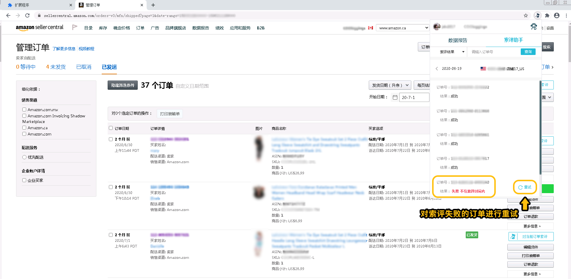 索评结果会在亚马逊后台页面展示,也可在索评助手插件上查看。