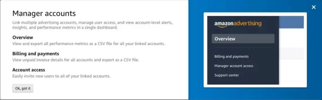 只有管理员可以关联或取消关联 账户、邀请用户和管理用户访问权限。每个管理员可以关联其他帐户,以便让您的所有广告展示在同一个位置。